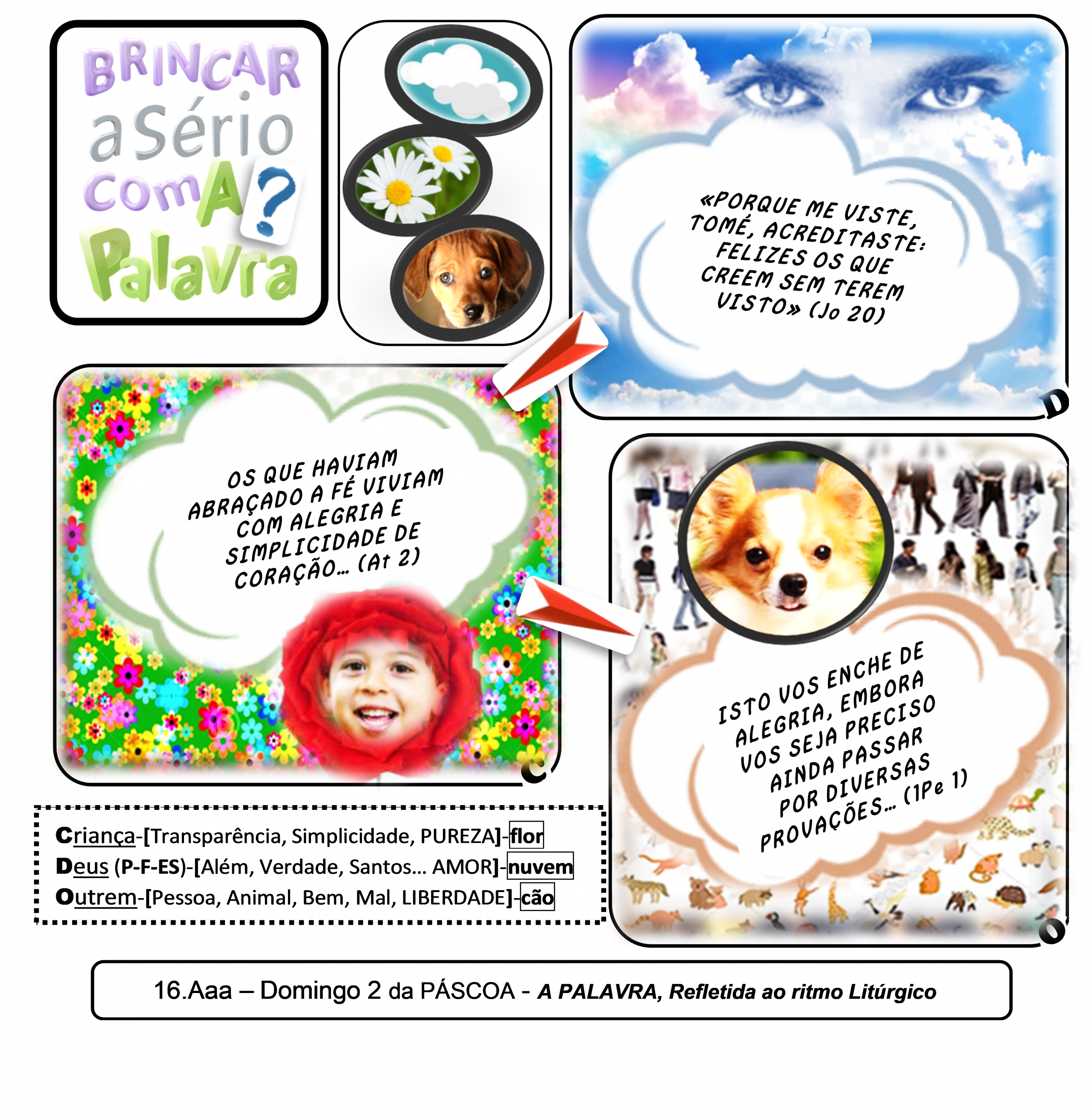 At 2,44.46: “Todos os que haviam abraçado a fé viviam unidos e tinham tudo em comum… Todos os dias frequentavam o templo como se tivessem uma só alma, e partiam o pão em suas casas; tomavam o alimento com alegria e simplicidade de coração”. // 1Pe 1,4-6: “Esta herança está reservada nos Céus para vós, que pelo poder de Deus sois guardados, mediante a fé, para a salvação que se vai revelar nos últimos tempos. Isto vos enche de alegria, embora vos seja preciso ainda, por algum tempo, passar por diversas provações…”. // Jo 20,27-29: “…E não sejas incrédulo, mas crente». Tomé respondeu-Lhe: «Meu Senhor e meu Deus!». Disse-lhe Jesus: «Porque Me viste acreditaste: felizes os que acreditam sem terem visto»”.