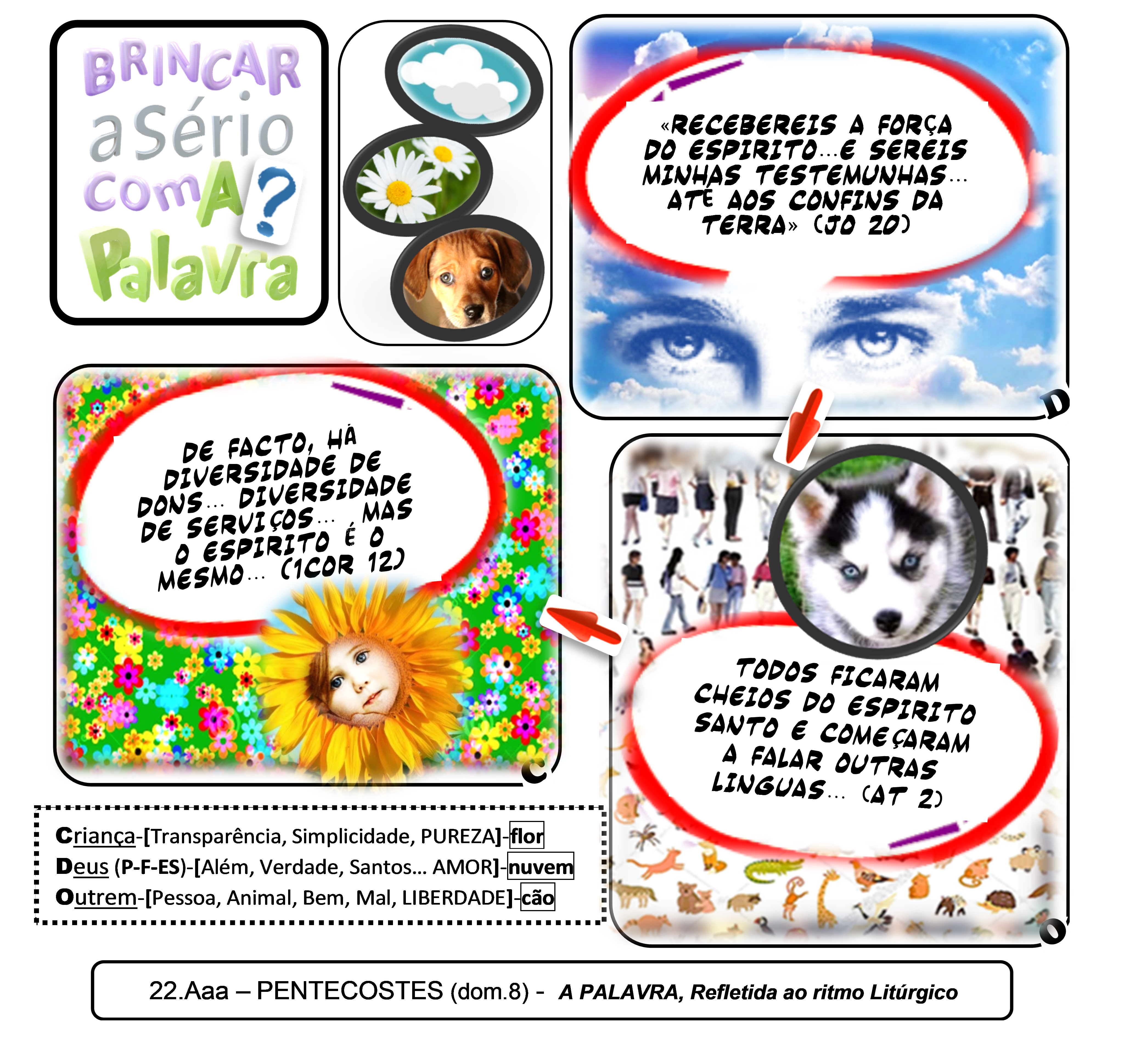 At 2,3-4: “Viram então aparecer uma espécie de línguas de fogo, que se iam dividindo, e poisou uma sobre cada um deles. Todos ficaram cheios do Espírito Santo e começaram a falar outras línguas, conforme o Espírito lhes concedia que se exprimissem”. // 1Cor 12,3-5: “Irmãos: Ninguém pode dizer «Jesus é o Senhor» a não ser pela ação do Espírito Santo. De facto, há diversidade de dons espirituais, mas o Espírito é o mesmo. Há diversidade de ministérios, mas o Senhor é o mesmo”. // Jo 20,21-22: “Jesus disse-lhes de novo: «A paz esteja convosco. Assim como o Pai Me enviou, também Eu vos envio a vós». Dito isto, soprou sobre eles e disse-lhes: «Recebei o Espírito Santo…»”.