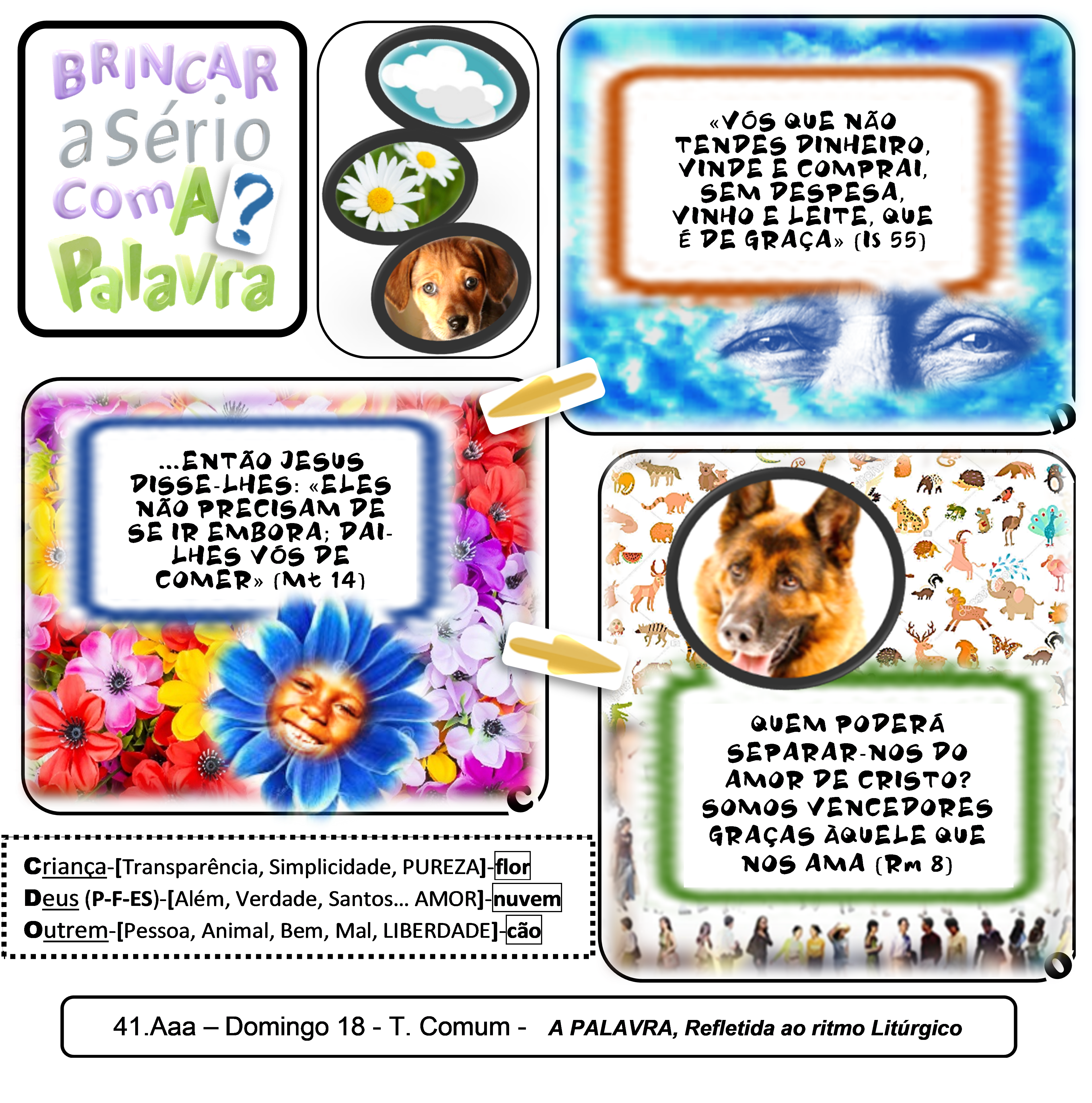 Is 55,1: “Vós que não tendes dinheiro, vinde, comprai e comei. Vinde e comprai, sem dinheiro e sem despesa, vinho e leite, que é de graça”. // Rm 8,35.37: “Irmãos: Quem poderá separar-nos do amor de Cristo? A tribulação, a angústia, a perseguição, a fome, a nudez, o perigo ou a espada?… Mas em tudo isto somos vencedores, graças Àquele que nos ama”. // Mt 14,14-16: “Ao desembarcar, Jesus viu uma grande multidão e, cheio de compaixão, curou os seus doentes. Ao cair da tarde, os discípulos disseram a Jesus: «Este local é deserto e a hora avançada. Manda embora toda esta gente, para que vá às aldeias comprar alimento». Mas Jesus respondeu-lhes: «Não precisam de se ir embora; dai-lhes vós de comer»”.