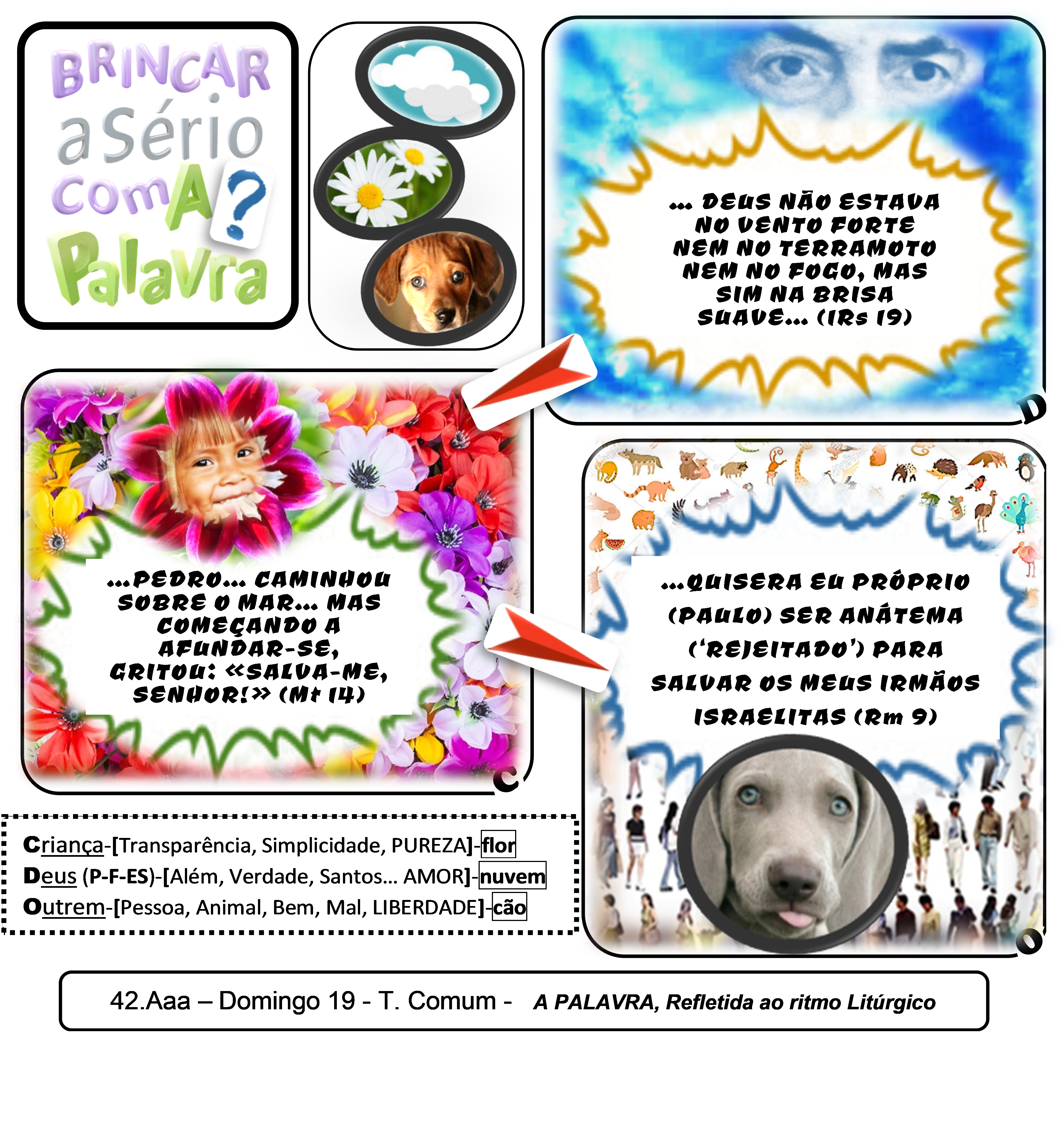 1Rs 19,11-12: “O Senhor… não estava na forte rajada de vento… nem no terramoto… nem no fogo… mas Ele fez-Se presente numa ligeira brisa…”. // Rm 9,3: “Quisera eu próprio ser anátema, separado de Cristo, para bem dos meus irmãos, que são do mesmo sangue que eu, que são israelitas…”. // Mt 14,29-31: “Pedro desceu do barco e caminhou sobre as águas… Mas, sentindo a violência do vento e começando a afundar-se, gritou: «Salva-me, Senhor!». Jesus estendeu-lhe logo a mão e segurou-o…”.