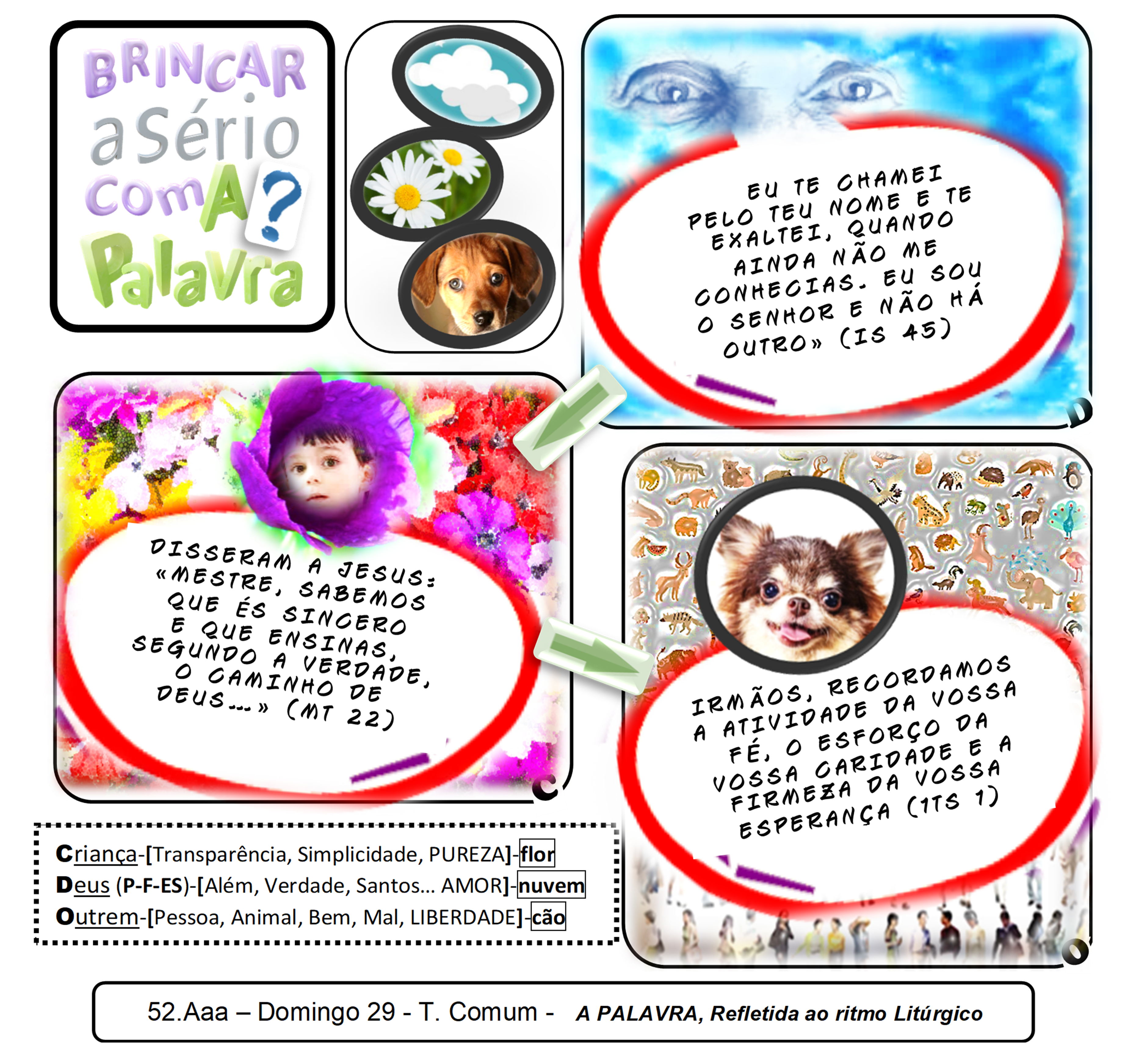 Mt 22,16.21: “«Mestre… sabemos que és sincero e que ensinas, segundo a verdade, o caminho de Deus, sem Te deixares influenciar por ninguém, pois não fazes aceção de pessoas… Disse-lhes Jesus: «Então, dai a César o que é de César e a Deus o que é de Deus»”. // Is 45,1.4-5: “Assim fala o Senhor a Ciro, seu ungido, a quem tomou pela mão direita…: Eu te chamei pelo teu nome e te dei um título glorioso, quando ainda não Me conhecias. Eu sou o Senhor e não há outro; fora de Mim não há Deus”. // 1Ts 1,2-3: “Damos graças a Deus por todos vós, ao fazermos menção de vós nas nossas orações. Recordamos a atividade da vossa fé, o esforço da vossa caridade e a firmeza da vossa esperança em Nosso Senhor Jesus Cristo, na presença de Deus, nosso Pai.”.
