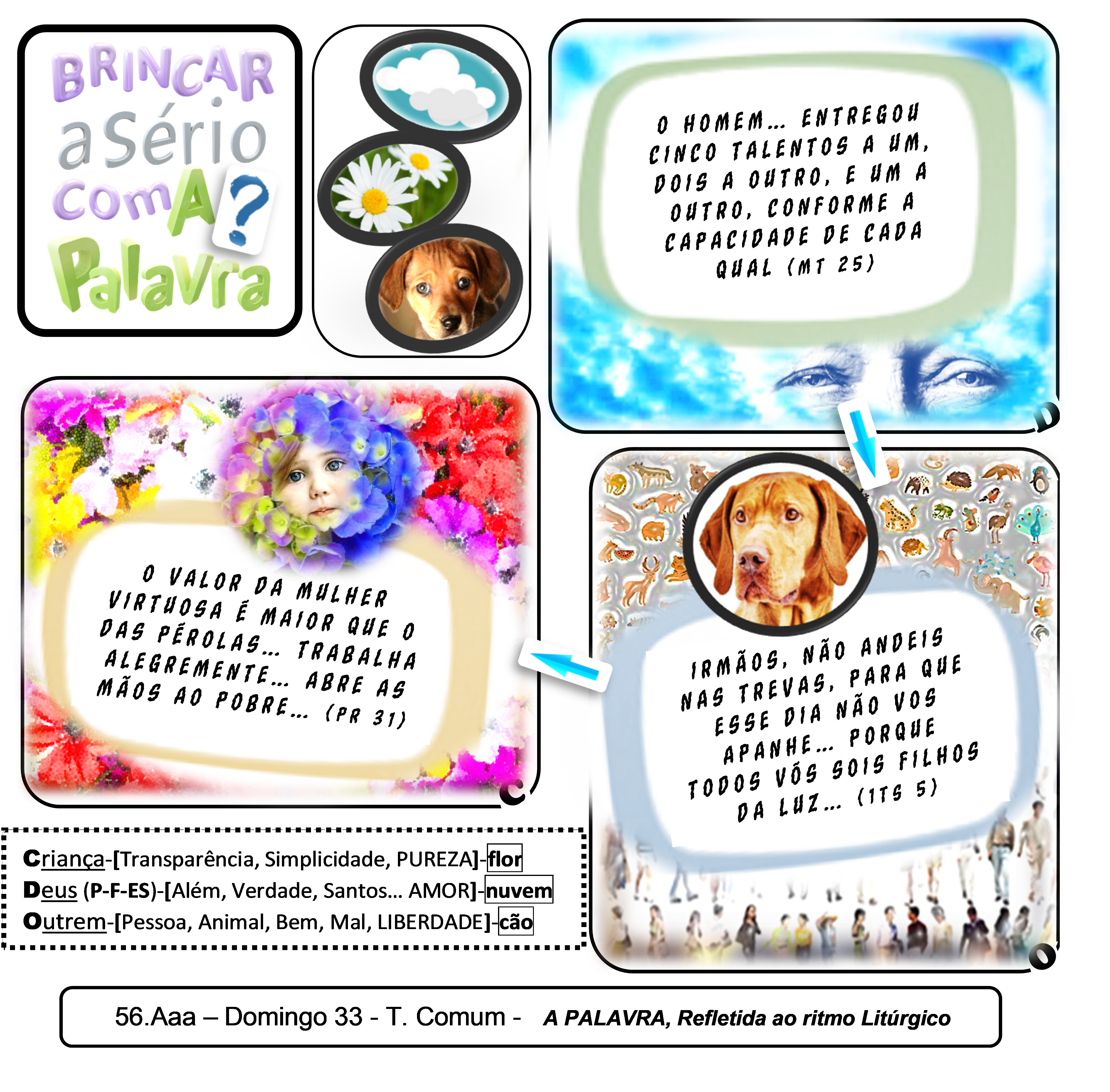 Pr 31,10-11.13.20: “Quem poderá encontrar uma mulher virtuosa? O seu valor é maior que o das pérolas. Nela confia o coração do marido, e jamais lhe falta coisa alguma… Procura obter lã e linho e põe mãos ao trabalho alegremente… Abre as mãos ao pobre e estende os braços ao indigente…”. // 1Ts 5,4-6: “Vós, irmãos, não andeis nas trevas, de modo que esse dia vos surpreenda como um ladrão, porque todos vós sois filhos da luz e filhos do dia: nós não somos da noite nem das trevas. Por isso, não durmamos como os outros, mas permaneçamos vigilantes e sóbrios”. // Mt 25,15.22-23: “…Aquele homem… entregou a um cinco talentos, a outro dois e a outro um, conforme a capacidade de cada qual; e depois partiu. …Veio o que recebera dois talentos e disse: ‘Senhor, confiaste-me dois talentos: aqui estão outros dois que eu ganhei’. Respondeu-lhe o senhor: «Muito bem, servo bom e fiel. Porque foste fiel em coisas pequenas, confiar-te-ei as grandes. Vem tomar parte na alegria do teu senhor»…”.