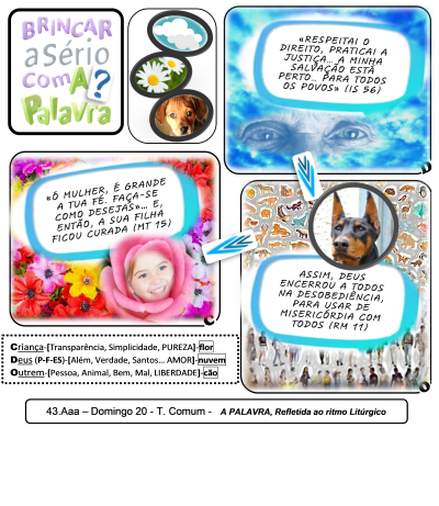 E a minha casa será chamada ‘casa de oração para todos os povos’»”. // Rm 11,15.32: “Da rejeição dos judeus resultou a reconciliação do mundo, o que será a sua reintegração senão uma ressurreição?… Efetivamente, Deus encerrou a todos na desobediência, para usar de misericórdia para com todos”. // Mt 15,22.28: “Então, uma mulher cananeia, vinda daqueles arredores, começou a gritar: «Senhor, Filho de David, tem compaixão de mim»… «Ó mulher, é grande a tua fé. Faça-se como desejas». E, a partir daquele momento, a sua filha ficou curada”.
