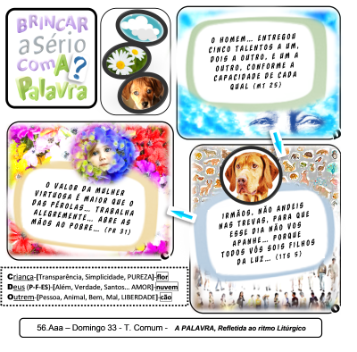 Pr 31,10-11.13.20: “Quem poderá encontrar uma mulher virtuosa? O seu valor é maior que o das pérolas. Nela confia o coração do marido, e jamais lhe falta coisa alguma… Procura obter lã e linho e põe mãos ao trabalho alegremente… Abre as mãos ao pobre e estende os braços ao indigente…”. // 1Ts 5,4-6: “Vós, irmãos, não andeis nas trevas, de modo que esse dia vos surpreenda como um ladrão, porque todos vós sois filhos da luz e filhos do dia: nós não somos da noite nem das trevas. Por isso, não durmamos como os outros, mas permaneçamos vigilantes e sóbrios”. // Mt 25,15.22-23: “…Aquele homem… entregou a um, cinco talentos; a outro, dois e a outro um, conforme a capacidade de cada qual; e depois partiu. …Veio o que recebera dois talentos e disse: ‘Senhor, confiaste-me dois talentos: aqui estão outros dois que eu ganhei’. Respondeu-lhe o senhor: «Muito bem, servo bom e fiel. Porque foste fiel em coisas pequenas, confiar-te-ei as grandes. Vem tomar parte na alegria do teu senhor»…”.